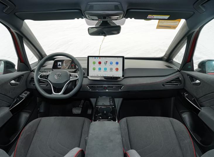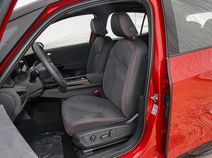 進入車內,ID.3 GTX套件款同樣帶來了驚喜。內飾被命名為“暗黑赤線”,整體基調以深邃的黑色為主,營造出神秘而又充滿運動感的氛圍。車廂內部進行了全面的“黑色化”處理,并大量使用了觸感更佳的麂皮材質進行包覆,無論是觸摸中控臺還是車門內飾板,都能感受到那細膩的質感。細節處輔以紅色縫線進行勾勒和點綴,這種紅黑搭配就像激情與冷靜的碰撞,進一步強化了運動氛圍。