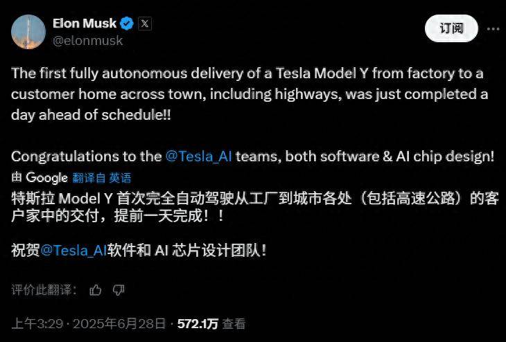 6月27日特斯拉宣布,一輛Model Y無人駕駛車從奧斯汀工廠開到了客戶家。全程沒人坐駕駛座,也沒遠(yuǎn)程操控,最高時(shí)速72英里??蛻艚蠮ose,他在社交平臺(tái)曬了和特斯拉自動(dòng)駕駛負(fù)責(zé)人的合影。馬斯克說這次交付“橫穿了整個(gè)城鎮(zhèn)”,比原計(jì)劃提前一天完成。