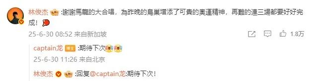 6月30日,林俊杰也在馬龍?jiān)u論區(qū)與其互動(dòng),稱“謝謝馬龍的大合唱,為昨晚的鳥(niǎo)巢增添了可貴的奧運(yùn)精神,再難得連三場(chǎng)都要好好完成”,并和馬龍約定下次再見(jiàn)。