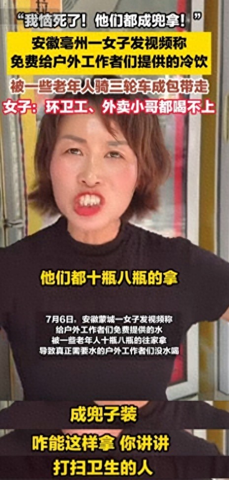 7月6號安徽亳州有個女子發視頻說氣哭自己了,她本來在路邊放了個冰柜給環衛工、外賣小哥送免費水,結果被好幾個老頭老太太騎三輪車來成箱扛走,搞得真正干體力活的人沒水喝。視頻里她一邊抹眼淚一邊說"他們吵架了,再這么下去誰還敢做好事"。
