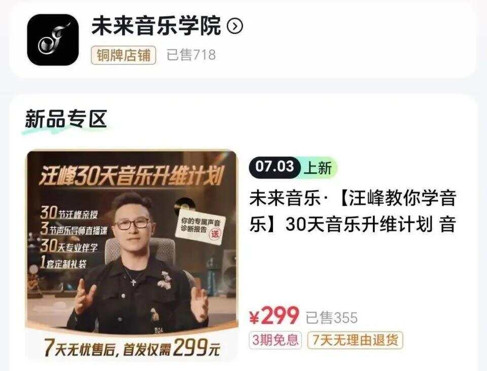 有不少網(wǎng)友發(fā)現(xiàn),這套299元的課程似乎銷量慘淡,店鋪內(nèi)顯示銷量僅兩百多套。截至7月19日,該課程在“未來音樂學(xué)院”的店鋪內(nèi)總共銷售了718套。從這一數(shù)據(jù)來看,汪峰的音樂課銷量確實(shí)不高。