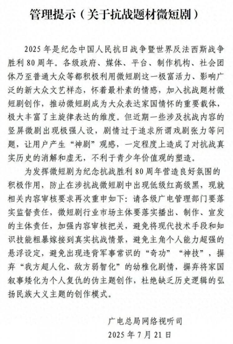 國家廣電總局網絡視聽司發布關于抗戰題材微短劇的《管理提示》。《管理提示》中提到,近期一些涉及抗戰內容的豎屏微劇出現極強人設,劇情過于追求所謂戲劇張力等問題,讓用戶產生“神劇”觀感,一定程度上造成了對抗戰真實歷史的消解和虛無,不利于青少年價值觀的塑造。