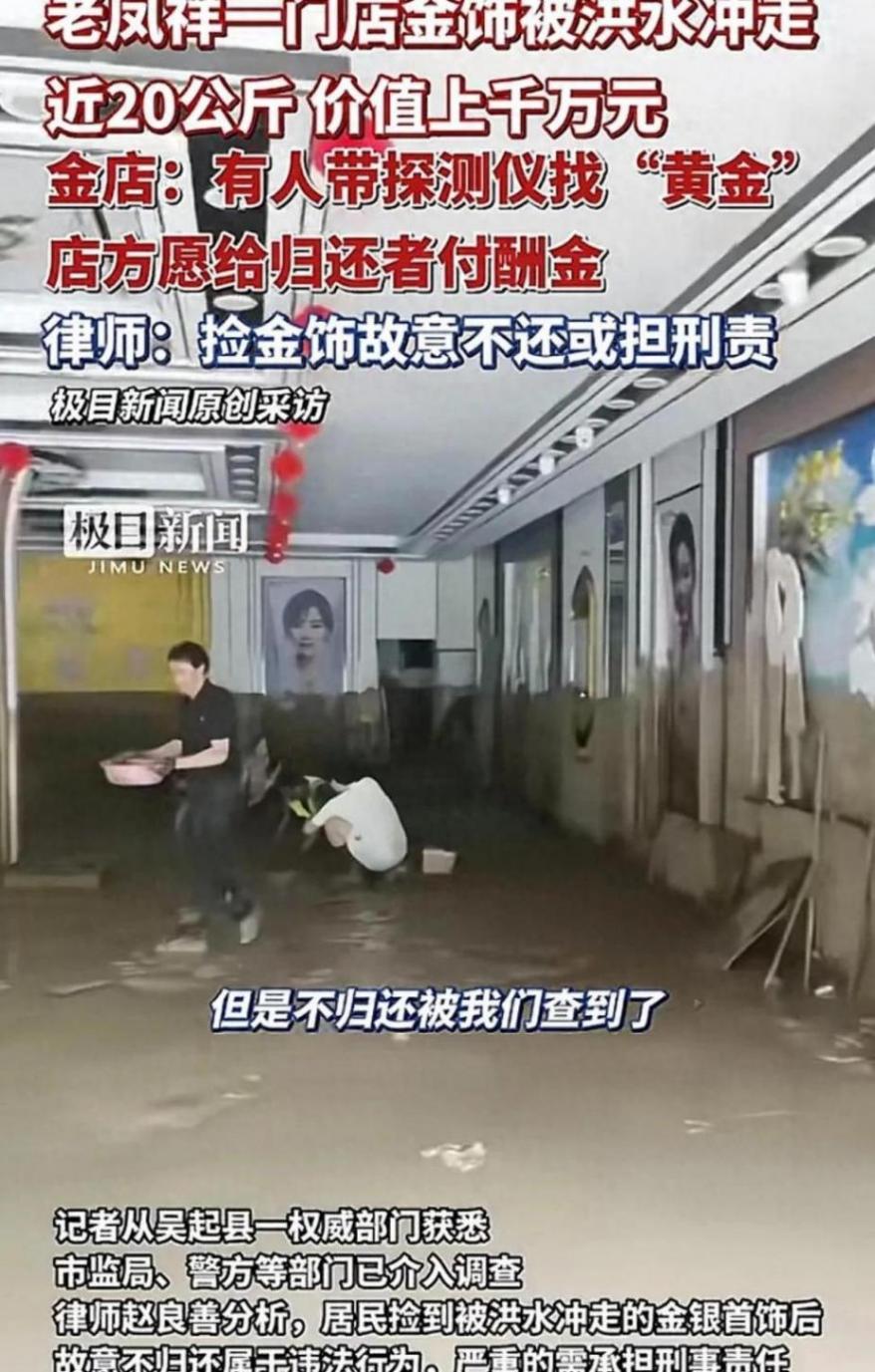 有工作人員表示,店里近20公斤的黃金首飾都被沖走了,價值上千萬,洪水退去,有人帶著探測儀在找黃金。