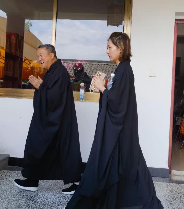 能夠看到他穿著黑色僧服,看上去一臉虔誠,身后還跟著一名年輕女子,與他穿著同款式的衣服。可能到寺廟做義工的人,都會配上這樣的服飾吧。