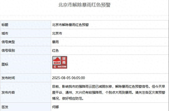目前,影響北京市的強(qiáng)降雨云團(tuán)已減弱東移,解除暴雨紅色預(yù)警信號(hào)。但今天早晨平谷、通州、大興仍有較強(qiáng)降雨,個(gè)別點(diǎn)大雨到暴雨。請(qǐng)關(guān)注各區(qū)災(zāi)害預(yù)警情況,做好相應(yīng)防范。