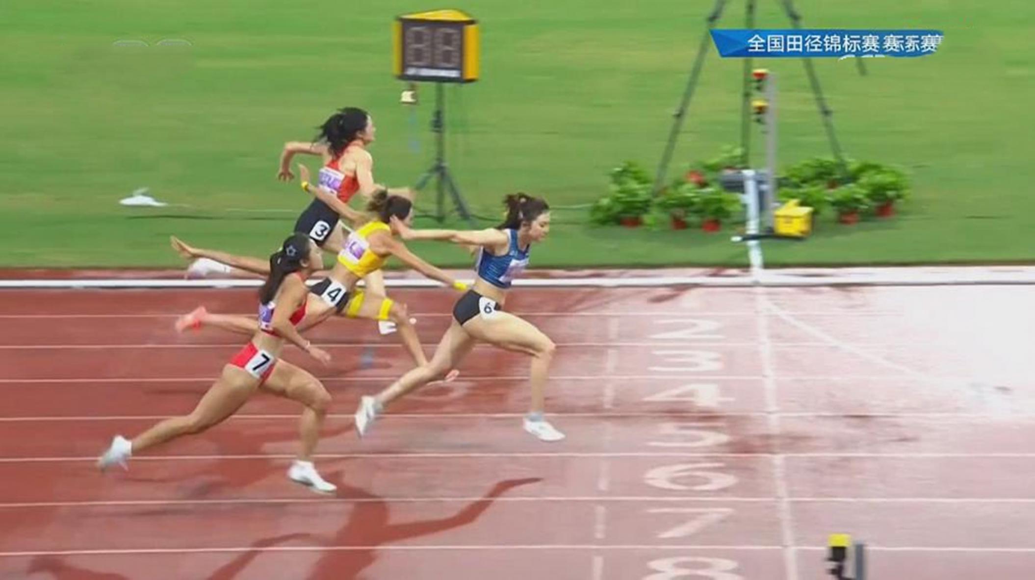 結果中途加速階段,第5道的劉景陽突然摔倒,但是并未影響到吳艷妮,她反而越跑越快,林雨薇壓力山大,奮力追趕,在攻下最后一個欄之后由于重心不穩,在撞線時也摔倒在地。