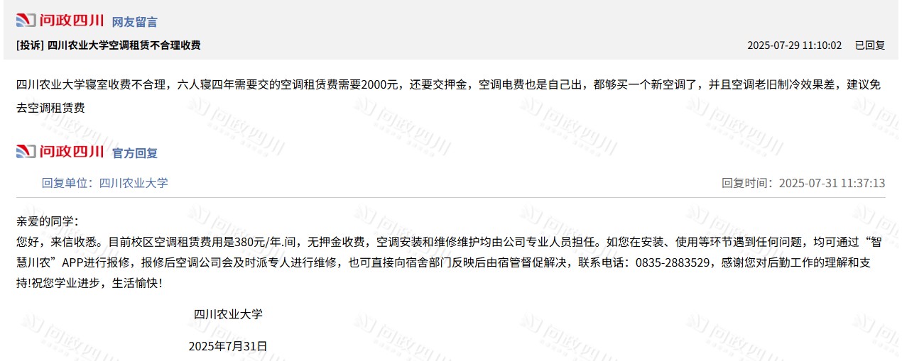 記者在“問政四川”平臺了解到,除了該校,當地多所高校如四川農業大學、成都工業學院等也被反映收取宿舍空調租賃費,網友表示空調電費也是自己出,希望能不再收取并退還已收取的費用。