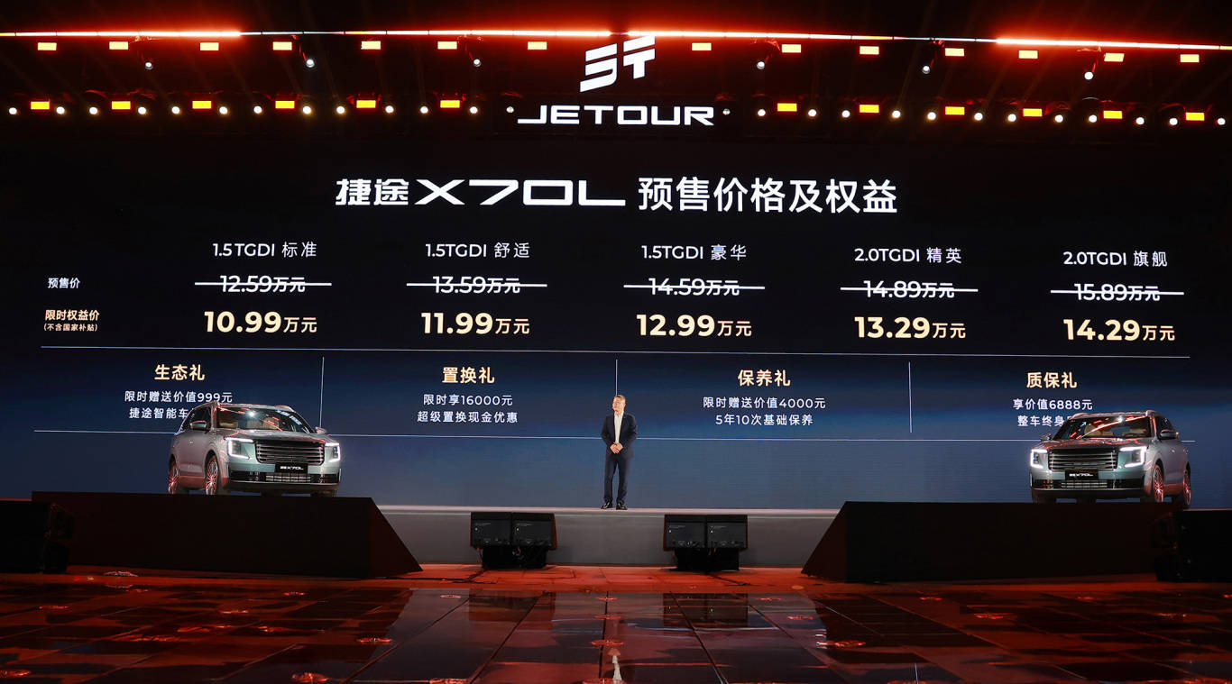 產品能否走進用戶的心智,價格是最為堅挺的杠桿。雖然還未正式上市,但在揚州的這場發布會上,官方為X70L帶來了預售價格。其涵蓋1.5T和2.0T共計5款產品,預售價區間為10.99萬-14.29萬元,同時捷途汽車還將為目標用戶帶來多項優惠權益,進一步增強產品性價比。