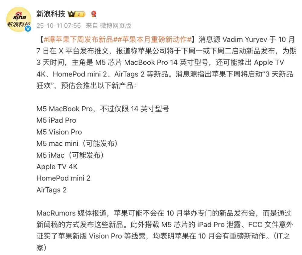按照這份爆料中的說法,將在下周到來新品包括M5 MacBook Pro 14 英寸、M5 Vision Pro、Apple TV 4K、HomePod mini 2、AirTags 2,還可能發(fā)布M5 mac mini、M5 iMac。