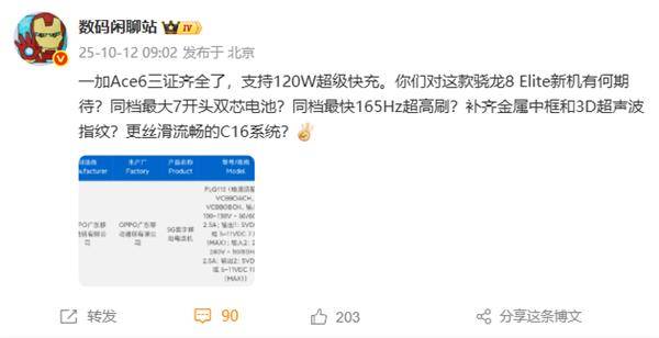 數碼博主“數碼閑聊站”表示,一加Ace 6已三證齊全,意味著符合上市條件,只差一個發布會就能上市發售。