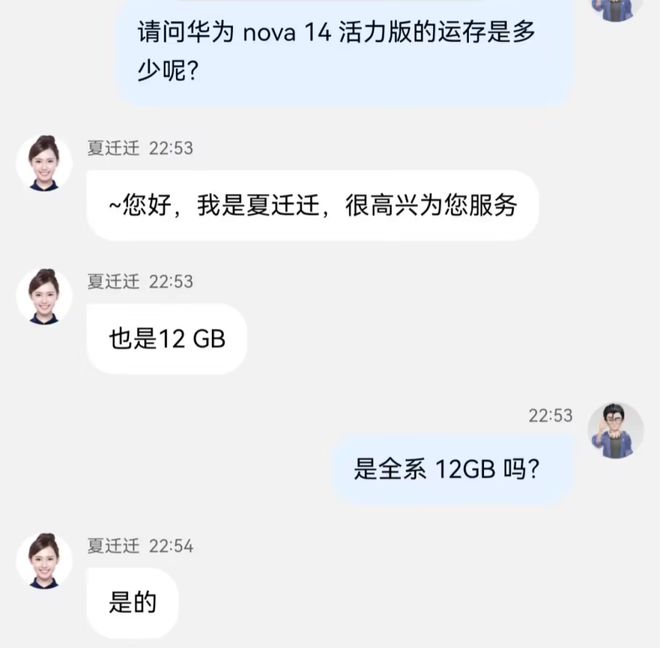 除了芯片配置的驚喜,華為官方客服也確認了一個重要信息:nova 14活力版全系統一配備12GB運行內存。