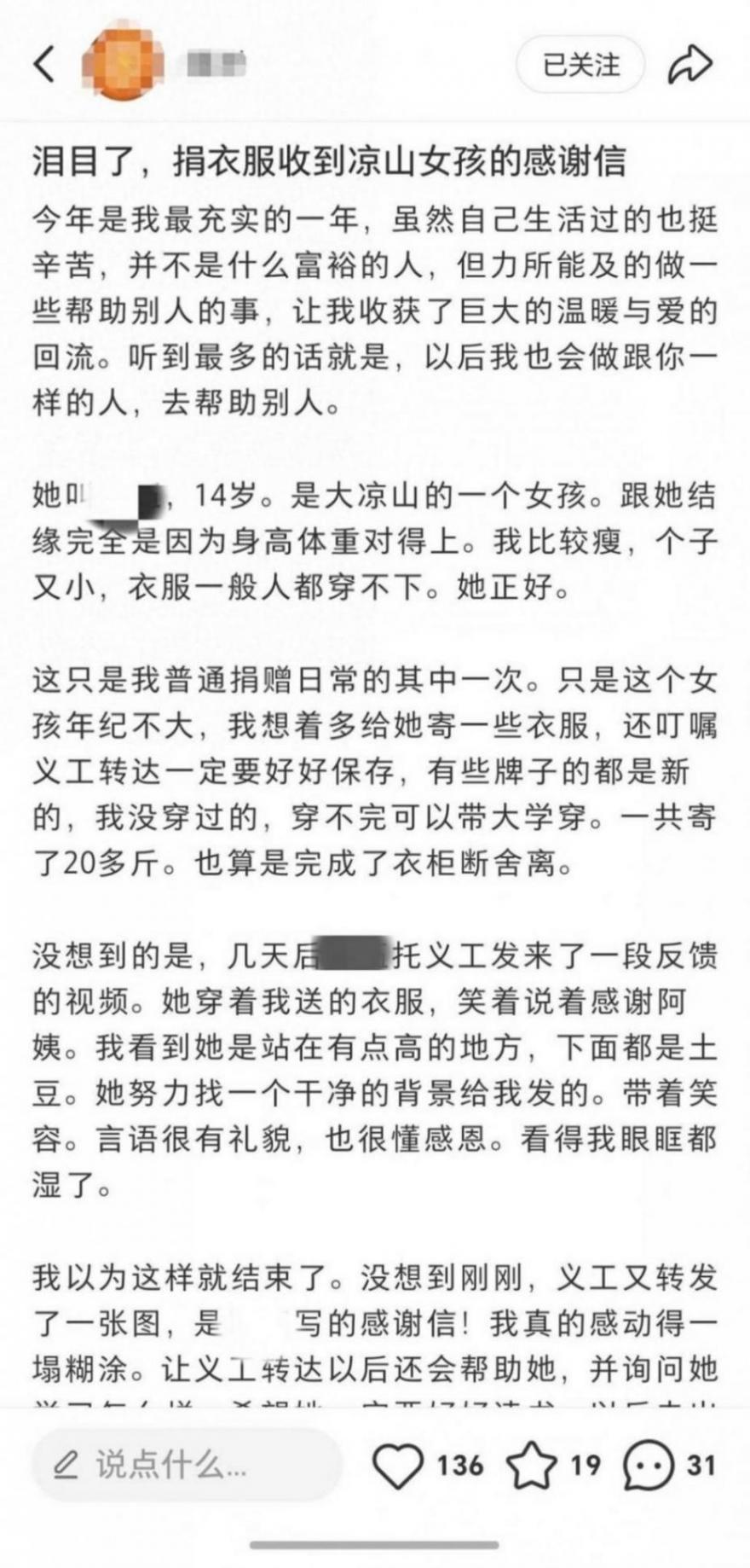 近日,有網友在社交平臺上發帖稱,她收到了一位14歲涼山女孩的感謝信,信中對她捐贈的衣服表示了感謝,雖然此前她也捐贈過多次衣服,但這是她第一次收到受捐者的親筆信,讓她不禁感嘆:“讓我收獲了巨大的溫暖與愛的回流。”