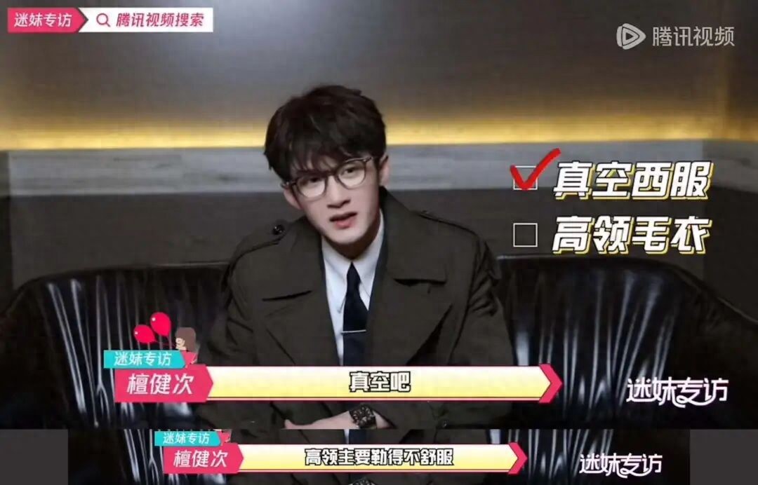 有明星曾表示自己不愛穿高領。一次快問快答中,檀健次在“真空西服”和“高領毛衣”里選擇了前者,理由是高領勒得不舒服。