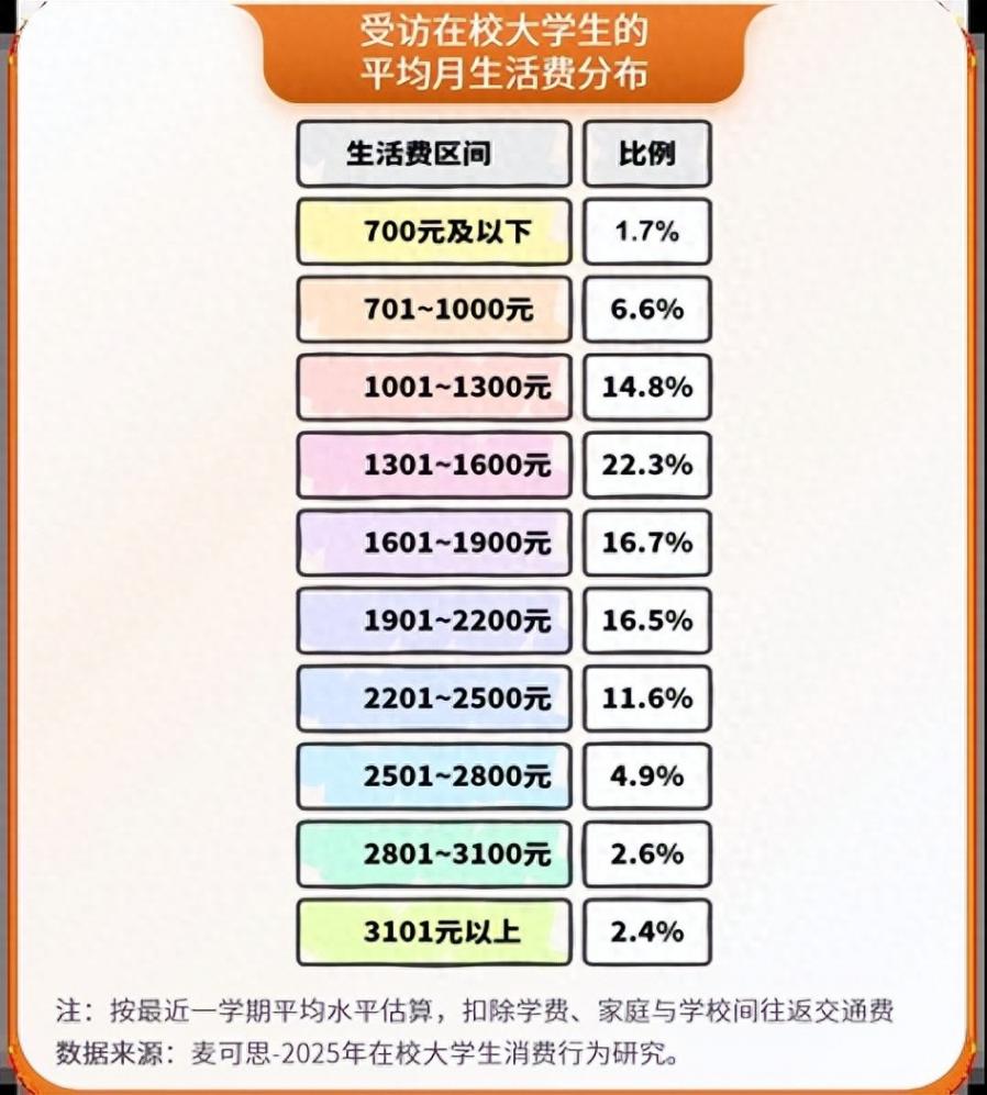 根據(jù)"麥可思-2025年在校大學生消費行為研究"對2783名在校生(含高職生715名、本科生1466名、研究生602名)的調(diào)查顯示,2025年大學生平均月生活費達1744元,較2016年增長43.9%。消費結(jié)構(gòu)呈現(xiàn)明顯分層: