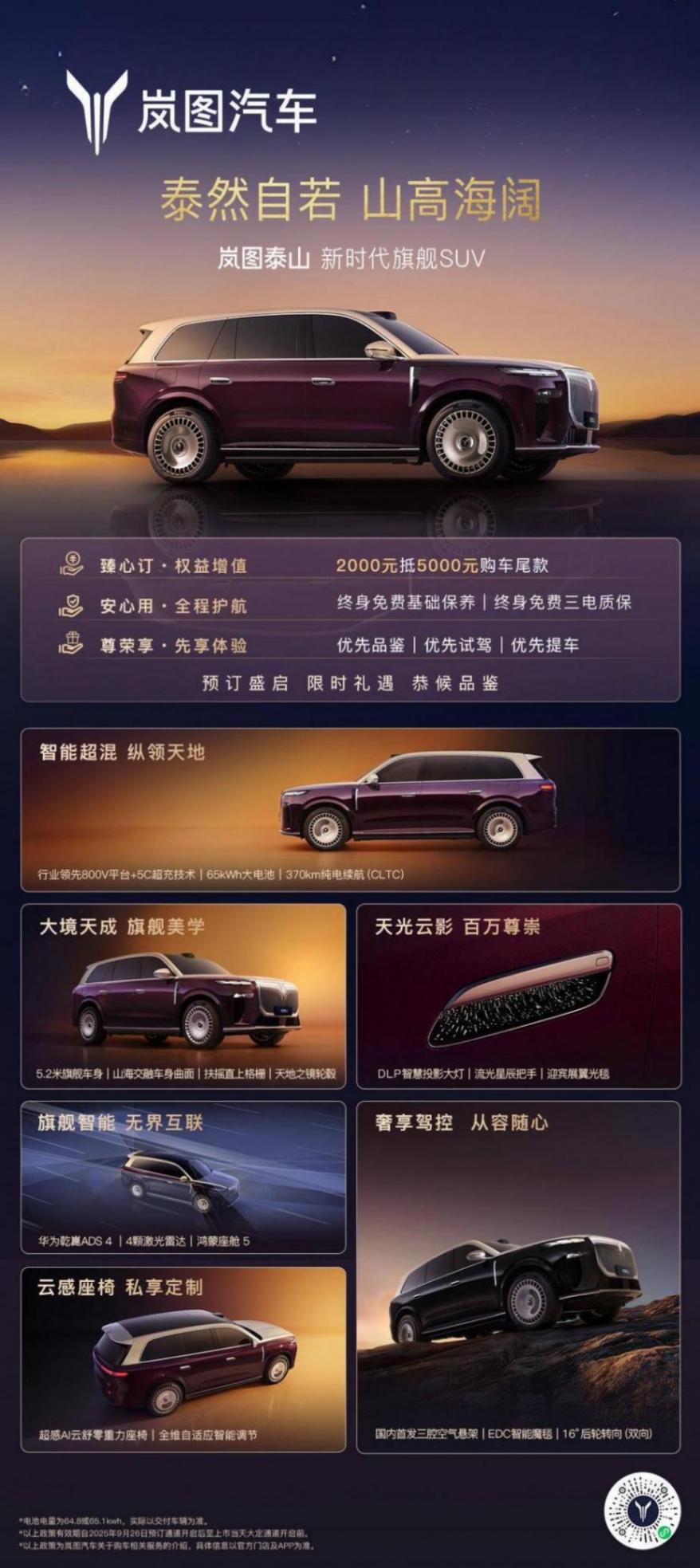 此前,嵐圖泰山已經開啟預售,官方并未公布新車價格,但已推出包括2000元訂金抵扣5000元尾款、終身免費保養、三電終身質保等多重尊享權益。