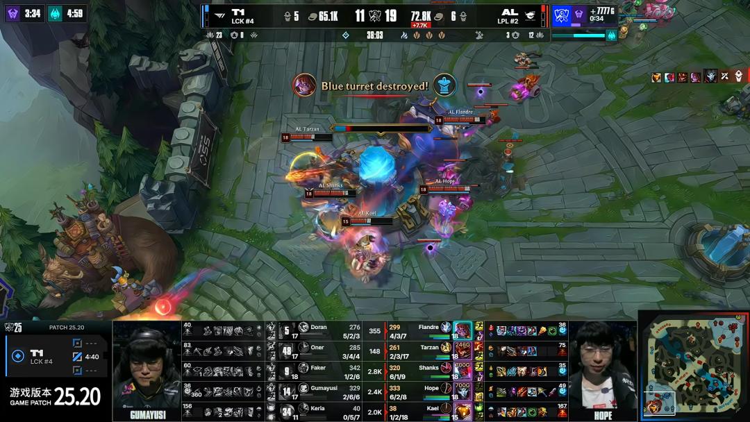 最后的決勝局,AL主帥Tabe押寶HOPE的個人能力,讓選擇了金克斯、璐璐、豬妹的保護發育組合,但T1拿出了梅爾、薩勒芬妮、艾希這三個擅長遠程攻擊的英雄進行應對。沒有了KAEL的開團,AL戰隊遭到了T1的遠距離消耗,AL對線階段全面劣勢,T1拿到了小龍、巢蟲等中立資源。