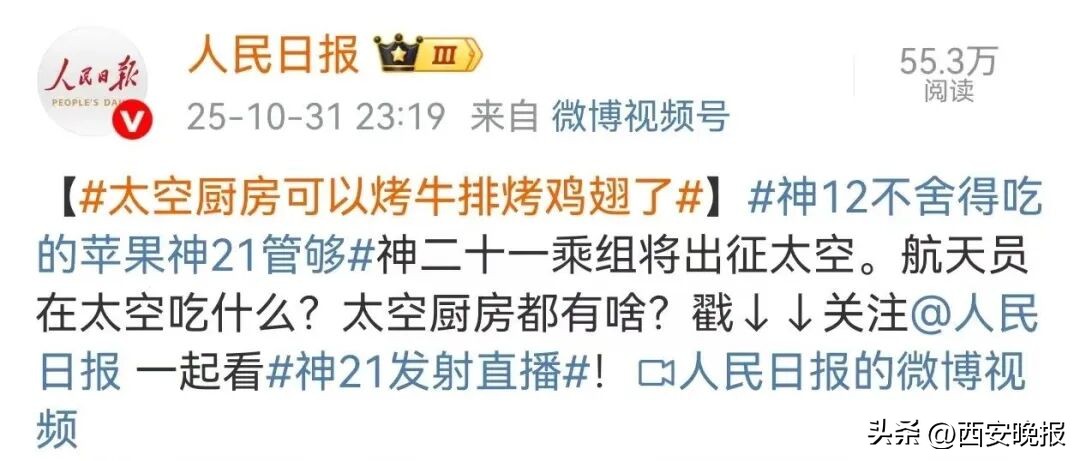 據中國載人航天工程辦公室消息,北京時間2025年10月31日23時44分,搭載神舟二十一號載人飛船的長征二號F遙二十一運載火箭在酒泉衛星發射中心點火發射。