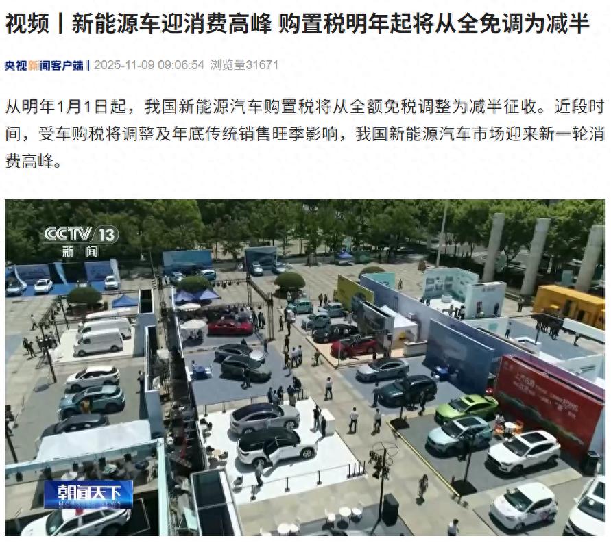 11 月 9 日消息,據央視新聞今日報道,從明年 1 月 1 日起,我國新能源汽車購置稅將從全額免稅調整為減半征收。近段時間,受車購稅將調整及年底傳統銷售旺季影響,我國新能源汽車市場迎來新一輪消費高峰。