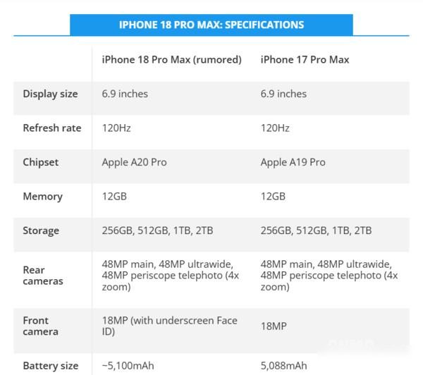 iPhone 18 Pro Max已經發布,參數看起來和上一代差別不大,屏幕還是6.9寸,刷新率保持120Hz,內存有12GB,存儲空間從256G到2TB都有選擇,攝像頭三顆都是4800萬像素,前置是1800萬,電池容量只增加12mAh,從5088變成5100,總的來說這不是一次大升級,而是小修小補,蘋果現在不做顛覆性改變,只是逐步加些功能,讓用戶用起來更順手。