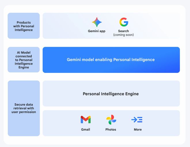 最關鍵的是底層新構建的 Personal Intelligence 引擎——這是一個全新的中間件,負責連接模型與用戶的私有數據源,包括 Gmail、Google Photos、YouTube 和搜索歷史等。